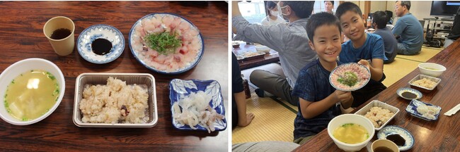 自分でさばいた刺身と、魚を余すことなく食べきる漁師街ならではのアラ汁、自ら獲ったタコのタコ飯でお昼ご飯タイム。「様々な体験を通して作った料理はとても美味しい」と感想が聞かれました。特に内臓入りのアラ汁は「コクがあって美味しい」と、お代わりする参加者が続きました。