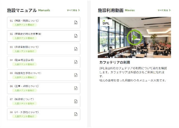入居テナント向けご案内(工事関係・結露対策・トラックバース管理予約システム等)、施設で働く従業員向けご案内(カフェテリア利用方法・ドライバー休憩所利用方法・保育施設利用方法・交通アクセス等)