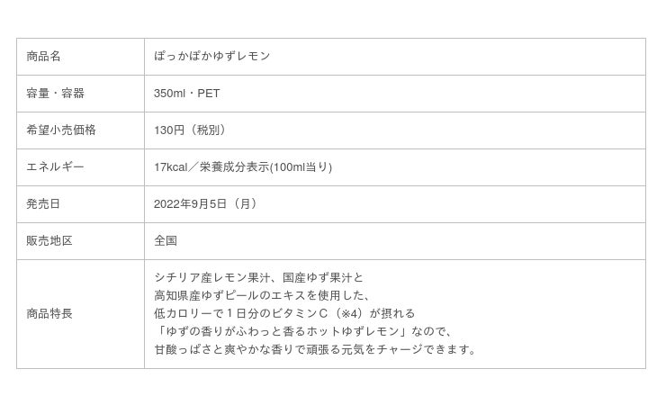 サッポロホールディングス(株)のグループ企業である、ポッカサッポロフード&ビバレッジ株式会社(代表取締役社長:征矢真一、本社:愛知県名古屋市)は、寒い季節を温かく過ごして頂けるホットドリンク「ぽっかぽかレモン350mlPET」「ぽっかぽかゆずレモン350mlPET」を2022年9月5日(月)より全国で新発売します。