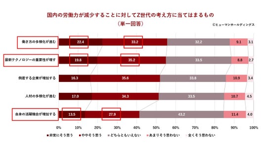 国内の労働力が減少していくことに対し、「働き方の多様化が進む」(55.6%)や「最新テクノロジーの重要性が増す」(55.0%)など、Z世代の社会の変化を前向きに捉える回答が半数を超えました。また、「自身の活躍機会が増加する」との回答も41.4%に達しており、社会の危機を新時代のチャンスと捉えるZ世代の姿が浮き彫りになりました。