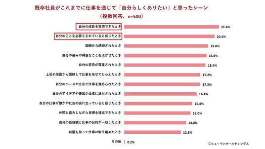Z世代のうち、26卒を除く既卒の500人がこれまでに仕事を通じて「自分らしくありたい」と思ったシーンは、「自分の成長を実感できたとき」(21.4%)が最多となりました。次いで「自分のことを必要とされていると感じたとき」(20.4%)、「周囲から感謝されたとき」(19.0%)、「自分の強みや得意なことを活かせたとき」(18.6%)が続いており、自己の成長や存在価値が自分らしさの源泉となっている様子がうかがえます。