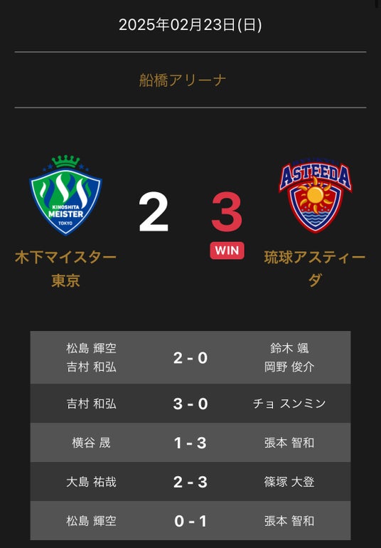 木下マイスター東京と琉球アスティーダの試合は、2-3で琉球アスティーダ