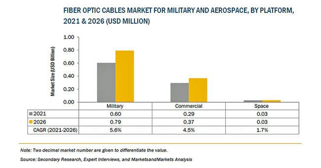 軍用プラットフォームに使用される光ファイバケーブルは、COVID-19の影響が最小限であったと報告されています。通信システムに使用される光ファイバケーブルの市場は、非常に健全な成長が見込まれており、2021年の6億米ドルから2026年には7億9000万米ドルに成長すると予想されています。このパンデミック状況下での、軍用の光ファイバケーブルの受注と納品に関する問題は見受けられませんでしたが、サプライチェーンの混乱は、同市場に若干のマイナスの影響を及ぼしました。その後、2021年第1四半期には緩やかに回復すると予測されています。