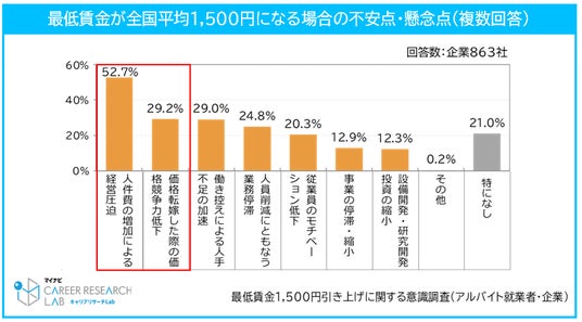 企業に、最低賃金が全国平均1,500円になる場合の不安点・懸念点を聞いたところ、「人件費の増加による経営圧迫(52.7%)」が最も高く、次いで「価格転嫁した際の価格競争力低下(29.2%)」となった。