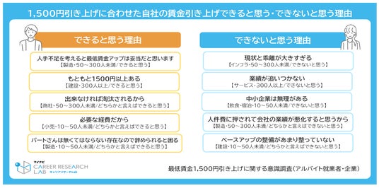 ◆56.3%の企業が、最低賃金の全国平均1,500円への引き上げに合わせて自社の賃上げは「できないと思う」。理由は「現状と乖離が大きすぎる」「業績が追いつかない」