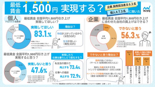 株式会社マイナビ(本社:東京都千代田区、代表取締役 社長執行役員:土屋芳明)は、全国の企業、個人を対象に実施した、「最低賃金1,500円引き上げに関する意識調査(アルバイト就業者・企業)」を発表しました。