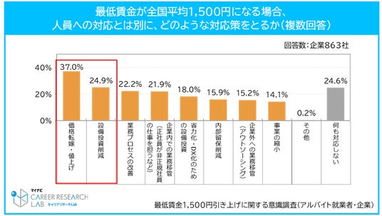 また、最低賃金が全国平均1,500円になった場合、雇用する人員に対してどのような対応をとるか聞くと、1人あたりの労働時間は「変えない(68.3%)」が最も多く、人員数(人員体制)についても、「変えない(64.9%)」が最も多かった。人員への対応とは別に、最低賃金が全国平均1,500円になる場合に企業としてどのような対応策をとるかでは、「価格転嫁・値上げ(37.0%)」が最も高く、次いで「設備投資削減(24.9%)」だった。【図6、7、8】