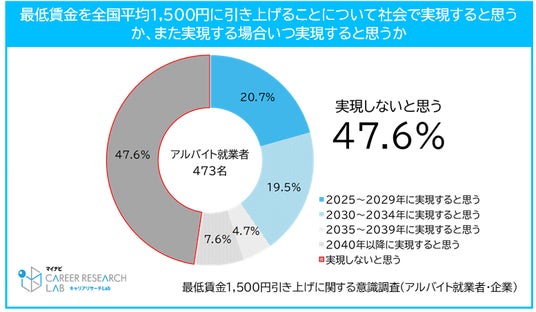 - 一方で、最低賃金の全国平均1,500円への引き上げについて、アルバイト就業者の約半数が「実現しないと思う」【図3】