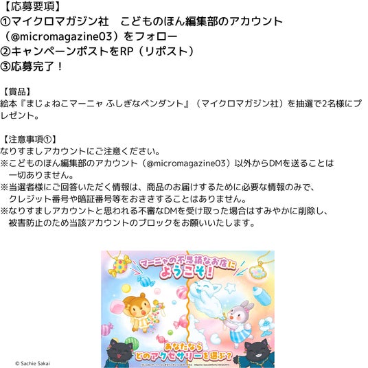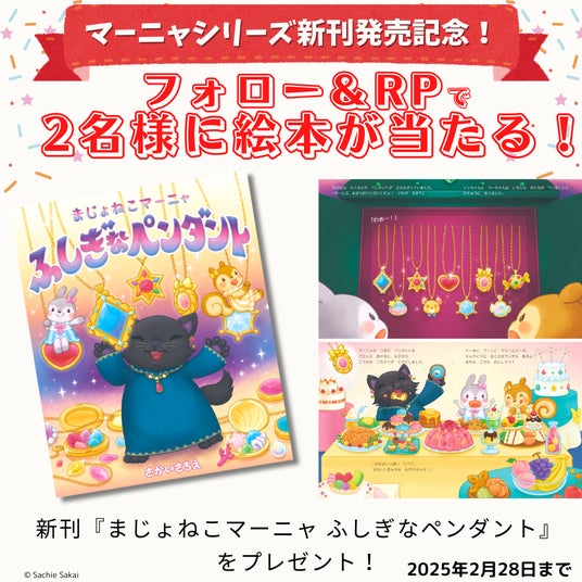 フォロー&リポスト(Instagramではいいね)をされた方から、抽選で2名様に絵本『まじょねこマーニャ ふしぎなペンダント』をプレゼント!