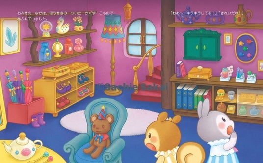 絵本の表紙には、マーニャのお店に並ぶ商品のように、キラキラとホログラム加工が!