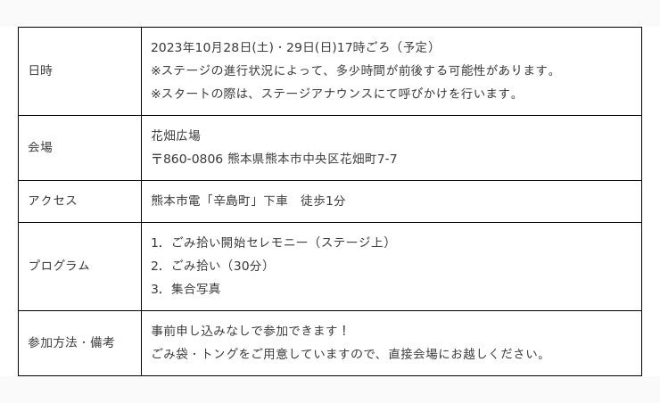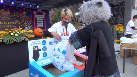 今年で開催4年目となる「くまハロ(くまもとハロウィン)」。熊本の秋を代表するお祭りで様々なハロウィンらしいエンターテインメントの体験を通して、熊本の食(農産物中心)を身近に感じられるイベントです。たくさんの方が仮装して熊本の農産物を楽しむ会場で陸と海のつながりを伝えることで、海洋ごみ問題にも関心を持ってもらおうと、”ハロウィン クリーン大作戦”を実施します。