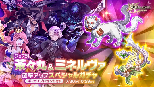 株式会社マーベラス(代表取締役社長:照井 慎一/所在地:東京都品川区)は、スマートフォン向け本格オンラインRPG『剣と魔法のログレス いにしえの女神』において、2025/7/23(水)に「ジョブ別 茶々丸&ミネルヴァ確率アップスペシャルガチャ」の販売、および「みんなで捕獲!アニマルキャッチャー!」の開催などを含むアップデートを行ったことをお知らせいたします。