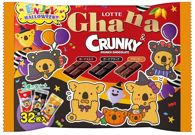 ひと口サイズのガーナミルク、ガーナブラック、クランキーが個包装に入った、ハロウィン限定デザインのシェアパックです。