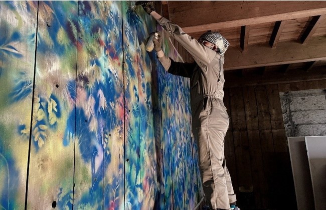 今秋、その石蔵が内装工事を行う事になり、剥がして廃棄する予定の室内に張られた100年前の古材をキャンバスに、札幌在住のアーティスト 前田麦(まえだ・ばく)氏が草花を使って描くアートプロジェクトそれが“GRASSITI(グラスィティ)"です。