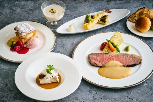 また、和洋中それぞれのシェフ自慢の料理を一度に味わえる『開業記念ディナーコース』は、「和洋中前菜の6種小鉢盛り」に始まり、和食からは見た目にも美しい「車海老と野菜の天ぷら盛り合わせ」、中国料理からは真鯛の風味を存分に味わえる「真鯛の葱生姜蒸し」、洋食からは赤身肉の旨味が凝縮された「国産ローストビーフ ポン酢カプチーノ」や、「北海道ホワイトコーンの冷製スープ」をお楽しみいただけます。さらに、デザートには、バターの香りが引き立つサクサクのパイ生地が人気の「こだわりの逸品 ミルフィーユ」をご用意します。