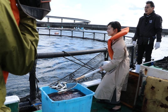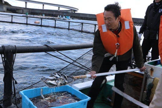 まずは養殖本まぐろのエサやり体験をすることに。エサのイワシをいけすに投入!