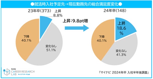 また入社前後で満足度が下降した割合は前年同値(40.1%)となったが、上昇した割合は18.6%(前年比9.8pt増)と、23年卒よりも入社後に満足度が上昇した人が多かった。一般的に入社直後はリアリティショック※2を感じやすいとされているが、24年卒は23年卒と比較してインターンシップ・仕事体験などの参加率も増加し、入社前の企業理解の機会の充実によって、リアリティショックが入社前に起こるケースもある。それにより就活時の満足度は低下するが、入社後のギャップが縮小すると推察される。【図3、4】