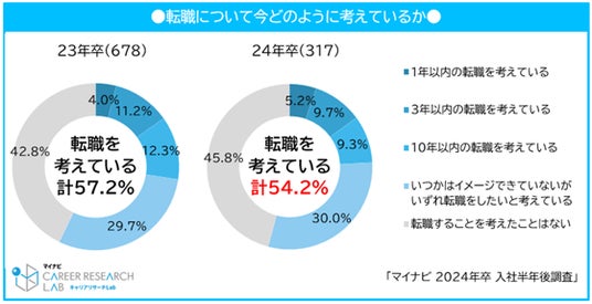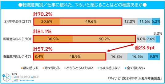 今後の転職意向について聞くと、転職意向がある割合は54.2%で、23年卒の57.2%から3.0pt減少した。「仕事に疲れた、つらい」と感じることがあるかを聞くと、全体で70.2%が「感じる(常に+時々)」と回答した。これを転職意向の有無で比較すると、転職意向なしのグループでは57.2%なのに対し、転職意向ありのグループでは81.1%と、23.9ptの差があった。