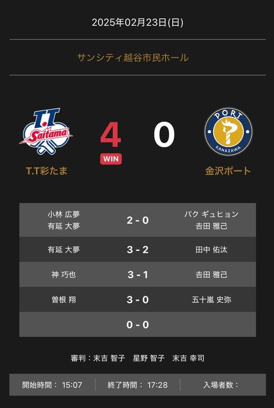 T.T彩たまと金沢ポートの試合は、4-0でT.T彩たまが勝利しました。