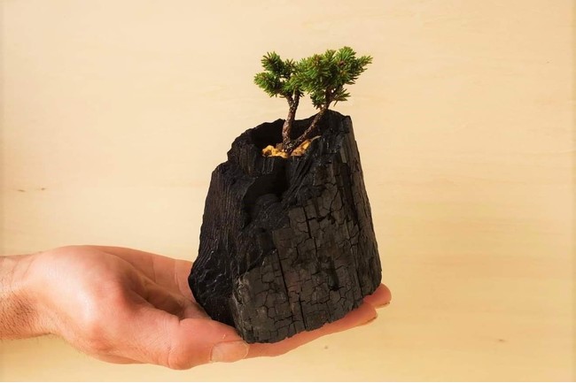 木炭をくり抜いた炭のうつわに盆栽の苗や多肉植物を植え付けて世界に一つだけの炭盆をお作り頂けます。原料の炭は、廃材や間伐材など通常は焼かれて処分されるものを再利用して作られています。
