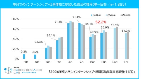 ◆11月単月のインターンシップ・仕事体験の参加率は前月比8.1pt増の52.2%