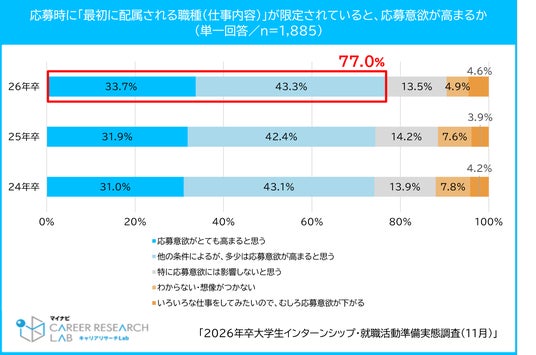 新卒入社後「定年まで働きたい」学生は22.4%で前年より増加。77.0%の学生が初期配属の職種が限定されていると「応募意欲が高まる」。80.8%の学生が勤務地が限定されていると「応募意欲が高まる」
