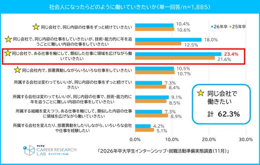 新卒で入社する会社で何年ぐらい働きたいかを聞いたところ、「特に決めていない・わからない」が30.5%で最多となったが、「定年まで」が22.4%(前年比2.3pt増)、「10年以上」が19.5%(前年比0.5pt減)という結果となり、約4割の学生が長期的なキャリアを見据えていることがわかる。また、社会人になったらどのように働いていきたいかを聞くと、「同じ会社で、ある仕事を軸にして、類似した仕事に領域を広げながら働いていきたい」と回答した学生が23.4%で最多となった。同じ会社で働きたいと考えている学生の合計は62.3%となり、現時点では半数以上の学生が転職をせずにキャリアを積んでいきたいと考えていることがわかる。【図3、4】