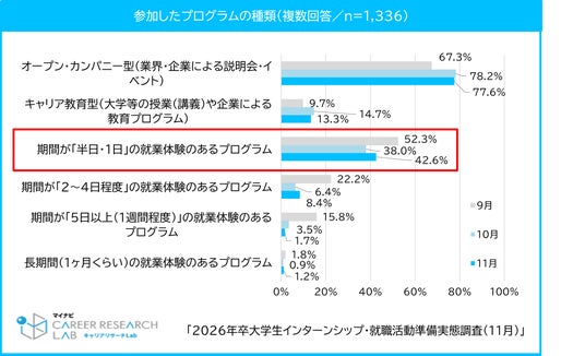11月単月でのインターンシップ・仕事体験の参加率は52.2%で、前月比8.1pt増となった。また、参加したプログラムの内容は、期間が「半日・1日」の就業体験のあるプログラムが前月比4.6pt増の42.6%だった。夏季休暇後は単月での参加割合が低下していたものの、11月は前月より参加率が増加する結果となり、短い期間でのプログラムに参加する学生が多いことがわかった。採用広報活動開始である3月が近づいているため、その準備として自身の学業やそれ以外のスケジュールなどを考慮し、現時点で気になる企業や業界に短期間で参加できるプログラムを中心に参加していると考えられる。【図1、2】