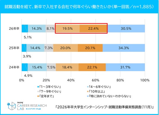 ◆入社後「定年まで」働きたい学生が22.4%で前年比2.3pt増