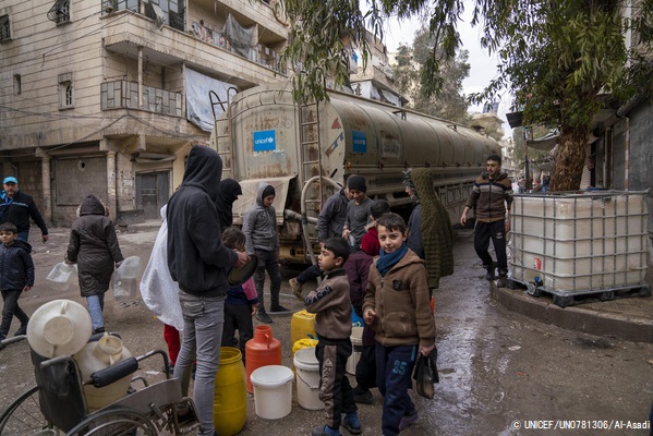 ユニセフはシリア北西部に支援物資を配備しており、12,000人に安全な水や衛生キットを届けるなど、可能な限り配布しています。