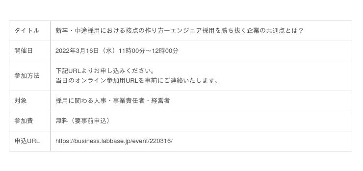 加茂倫明)と共同で、2022年3月16日(水)に無料オンラインセミナー「新卒・中途採用における接点の作り方ーエンジニア採用を勝ち抜く企業の共通点とは?」を開催いたします。