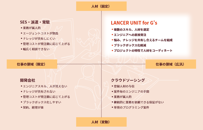 IT関連及びデジタルコンテンツの人材養成スクール・大学・大学院を運営するデジタルハリウッド株式会社(本社:東京都千代田区、代表取締役社長兼CEO吉村毅、学長 杉山知之)が提供をする、デジタルハリウッド在校生・卒業生のための様々なワークスタイルを実現するためのキャリアサポート『xWORKS(エックスワークス)』は、DXを推進する企業のWebサービスやシステム開発、IT系の新規事業の立ち上げに必要な人的リソースをチーム組成して継続的にサポートする、新しいエンジニアチームランスマッチングサービス「ランサーユニットfor G’s」を4月4日(月)より開始致します。