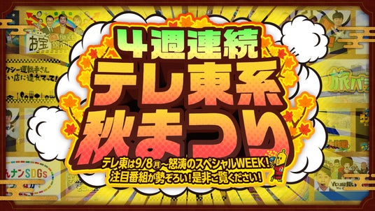 テレ東は9月に様々なテーマで毎週毎週、豪華ラインナップを放送!「4週連続 テレ東系秋まつり!」と題し、まるでお祭りのような1カ月の視聴体験を視聴者に提供します。