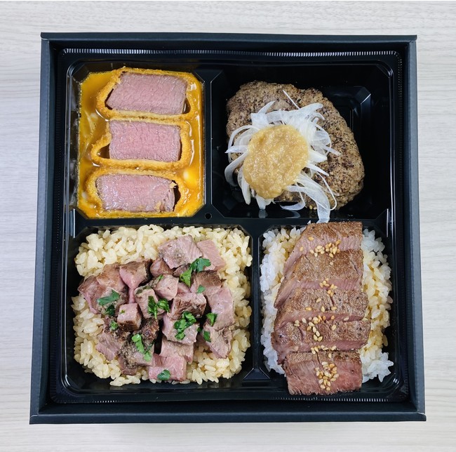 白老牛のサーロインステーキ、赤身ステーキ寿司、牧場自家製のハンバーグ、香味焼きを一度に楽しめる贅沢なお弁当です。