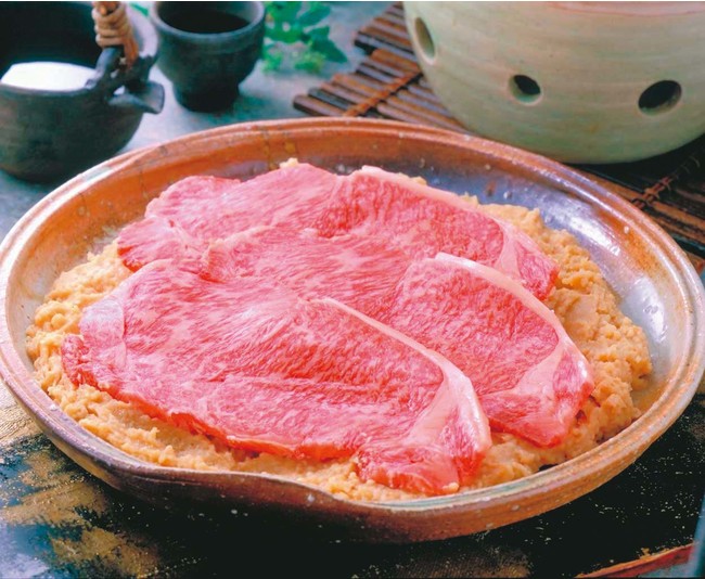 日本最古の和牛ブランドである近江牛のルーツ的存在の味噌漬け。良質な肉質の近江牛を、白粒味噌によって旨みを最大限に引き立てた味噌漬け。江戸元禄年間、将軍家に献上されていたといわれる味噌漬けを、今回は特別に店頭実演にて味噌漬けを仕込み、浸かり具合いを見ながら食べ頃の状態でご提供いたします。