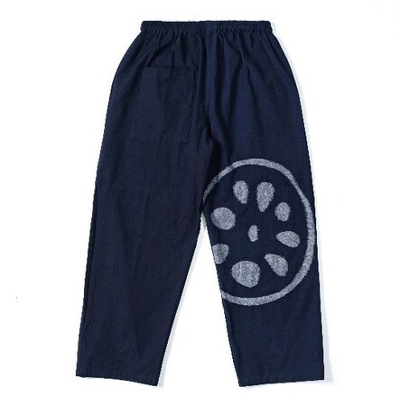 生地は着用時にレンコンが真ん中に表れるように計算し、もんぺのためだけに織り上げています。