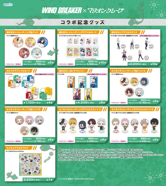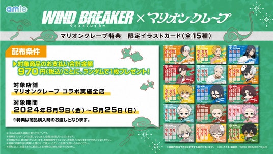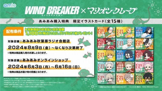 ホビー通販大手で、商品企画制作も行う「あみあみ」(大網株式会社、東京都文京区)は、TVアニメ『WIND BREAKER』と、人気クレープショップ「マリオンクレープ」とのコラボレーション企画を、2024年8月9日(金)~8月25日(日)にかけて9エリア20店舗で開催いたします。