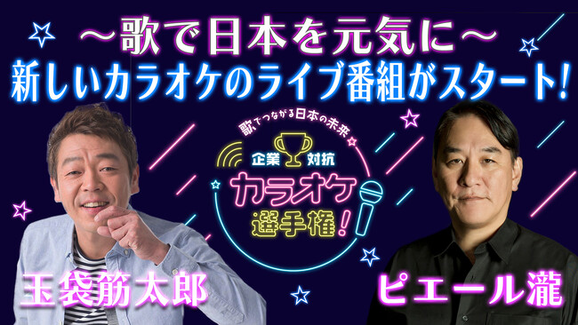 企業の応援団長に玉袋筋太郎とピエール瀧、進行に大島由香里を迎えた第一回「企業対抗カラオケ選手権」は、6月22日(木) 19:30~21:30に開催!幅広い業種から集まった全6社が玉袋筋太郎とピエール瀧のチームに分かれ、歌唱力やパフォーマンス、チームワークを競うガチンコ対決!審査員による評価とカラオケ採点の総合得点で決するカラオケバトルを制するのは、どちらのチームか!?当日の模様は、新感覚のカラオケ番組としてYouTubeでライブ配信を実施し、どなたにでもご覧いただけます。また、7月27日(木)に第2回、8月下旬に第3回の開催も決定しており、出場企業のエントリー受付については本編番組サイト、番組公式SNSに順次お知らせします。