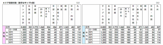 ※男女それぞれ、年齢5歳刻みで均等割付(エリアと年代による割付数詳細は下記数表を参照)