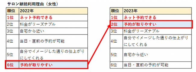ポイント3. サロン継続利用理由で「予約が取りやすい」が男女とも前年から最も増加