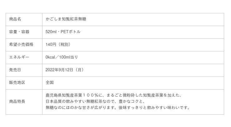 サッポロホールディングス(株)のグループ企業である、ポッカサッポロフード&ビバレッジ株式会社(代表取締役社長:征矢真一、本社:愛知県名古屋市)は、「かごしま知覧紅茶無糖」を2022年9月12日(月)よりリニューアル発売します。