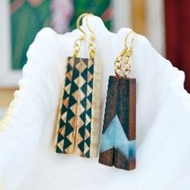 〈Wood Touch〉(左)ピアス「Kai Nalu」(木材、サージカルステンレス) 3,300円、(右)ピアス「Wailele」(木材、エポキシレジン、サージカルステンレス) 4,290円