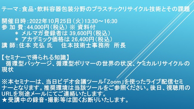 先端技術情報や市場情報を提供している(株)シーエムシー・リサーチ(千代田区神田錦町: https://cmcre.com/ )では、 各種材料・化学品などの市場動向・技術動向のセミナーや書籍発行を行っておりますが、 このたび「食品・飲料容器包装分野のプラスチックリサイクル技術とその課題」と題するセミナーを、 講師に住本 充弘 氏 住本技術士事務所 所長)をお迎えし、2022年10月25日(火)13:30より、 ZOOMを利用したライブ配信で開催いたします。 受講料は、 一般:44,000円(税込)、 弊社メルマガ会員:39,600円(税込)、 アカデミック価格は26,400円(税込)となっております(資料付)。