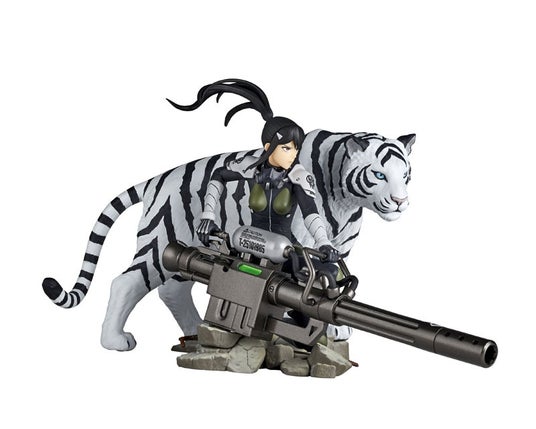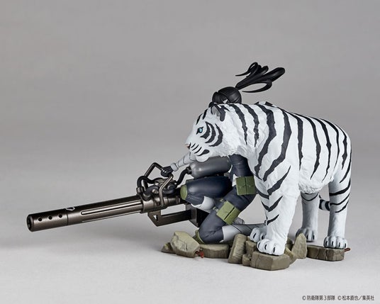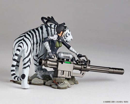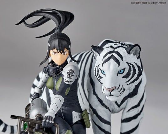 淡泊な態度の下に、人々を守るため怪獣討伐に人生をかける情熱を秘めた亜白ミナを、海洋堂ならではの造形表現でお手元にどうぞ!●正面を見つめる視線に、彼女のクールな魅力を込めました。ポニーテールのロングヘアがなびく様子は、静かなポーズの中で前後のアクションを感じさせる動きを演出します。●伐虎はミナのスリムなボディを際立たせる相棒としても、キャラクターとしても見どころに。野生を感じさせる逞しい体躯、毛並みまで作り込みました。●大口径の砲身を持つ専用装備は、全長約12センチ!武器としての機能性も感じられるデザインを精密に造形しました。製品ページはこちら: