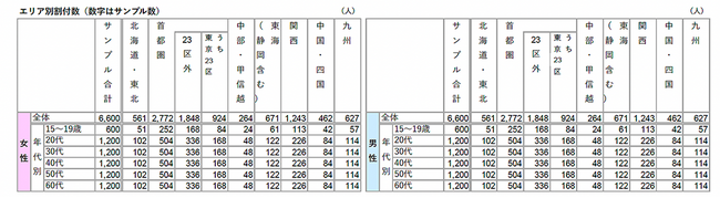※男女それぞれ、年齢5歳刻みで均等割付(エリアと年代による割付数詳細は下記数表を参照)