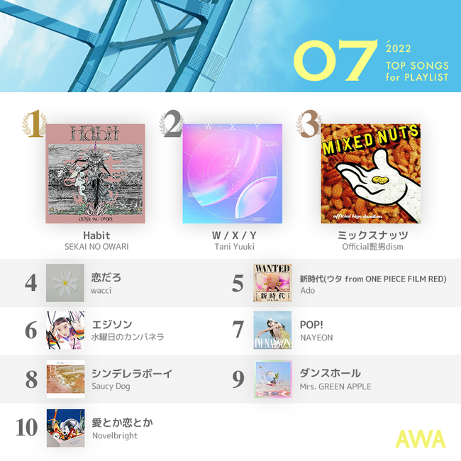 ~2022年7月度のAWAプレイリスト採用楽曲ランキングを発表~