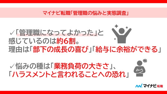 「管理職になって良かった」と感じている人は約6割。理由は「部下の成長の喜び」や「給与面に余裕ができる」。 悩みの種は「業務負荷の大きさ」「ハラスメントと言われることへの恐れ」