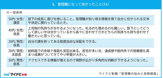 また、「管理職になって良かったこと」を自由回答できいたところ、「部下の成長に喜びを感じる」「自分の課を持ってある程度自由な采配ができる」「給料面での余裕で家庭も安定する」などが挙がった。【図2】