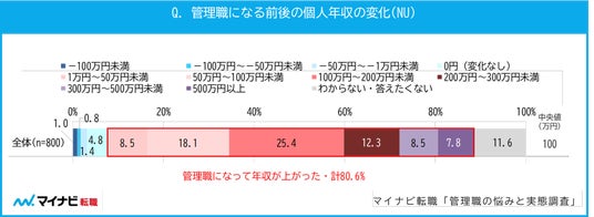 管理職になる前後の年収の変化をみると、管理職になり給与が上がった人は8割以上で変化額の中央値は100万円増だった。【図3】