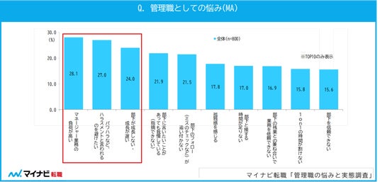 株式会社マイナビ(本社:東京都千代田区、代表取締役 社長執行役員:土屋芳明)が運営する総合転職情報サイト『マイナビ転職』(https://tenshoku.mynavi.jp/)は、800名の管理職を対象に行った「管理職の悩みと実態調査」の結果を発表しました。本調査では、管理職が抱えている悩み、孤独感、給与や生活の変化などが明らかになりました。